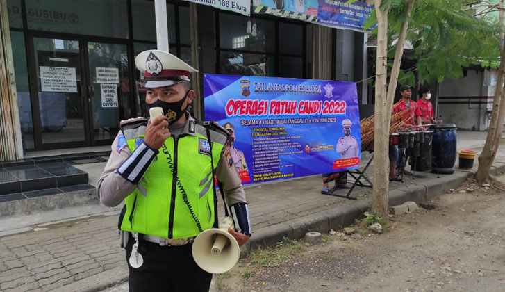 BLORA  –  Terobosan demi terobosan terus dilakukan  Satgas Operasi Patuh Candi 2022 Polres Blora dalam menggelar sosialisasi dan edukasi tertib lalu lintas kepada warga. Salah satunya Jumat, (17/06/2022), menyuguhkan musik angklung lokal Blora saat operasi.