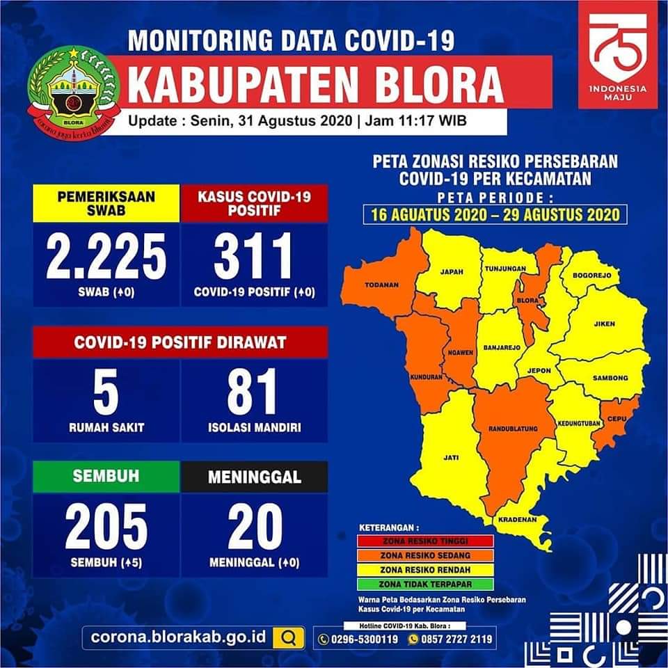 ” TINGKAT penularan kasus Covid-19 di Blora masih cukup tinggi. Dalam empat hari terakhir ( 28-31 Agustus 2020) ada 26 kasus Covid baru yang tersebar di sejumlah kecamatan, termasuk ada penambahan 4 penderita yang meninggal dunia….”
