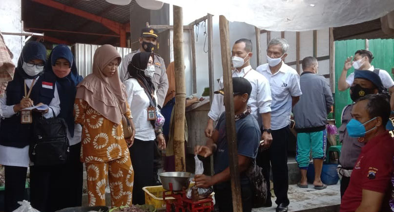 SIDAK : Petugas gabungan di Blora, (Dinkes, Dindagkop, Labkesda, Polres) saat sidak makanan (jajanan) di Pasar Kecamatan Kunduran, Rabu (13/04/2022).