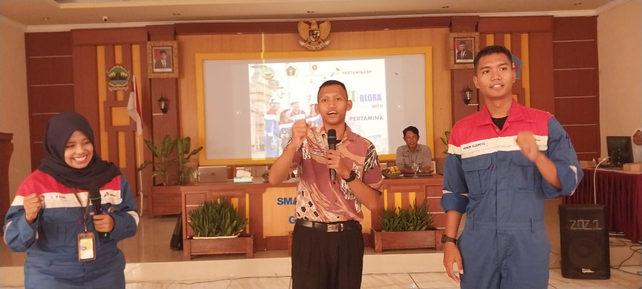 Salah satu siswa SMA 1 Blora berinteraktive dengan ke 2 narasumber dari Pertamina.|| Foto: Muji/topdetiknews.com