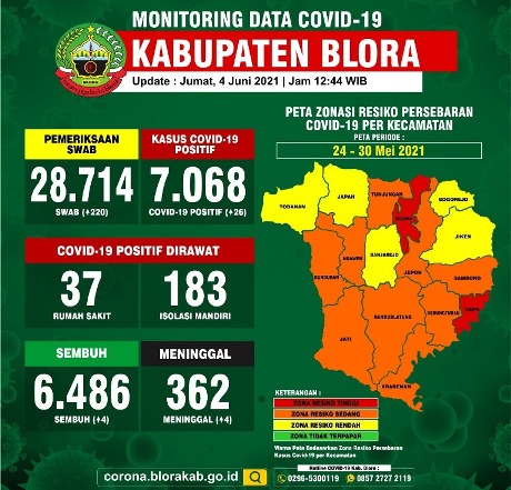 Sementara itu, dari hasil monitoring data Covid-19 Kabupten Blora, per Jumat (4/6/2021) pukul 12.44 WIB, diketahui kasus Covid di Blora terus merangkak naik. Dalam sehari ada tambahan 26 kasus, sehingga total kasus yang ada mencapai 7.068.